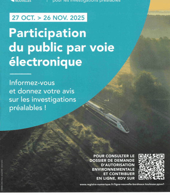 Vous avez eu connaissance de la consultation publique par voie électronique du 27 octobre 2025 au mercredi 26 novembre 2025 portant sur la demande d’autorisation environnementale relative aux investigations préalables à la réalisation de la ligne nouvelle Sud-Ouest entre Bordeaux et Toulouse.